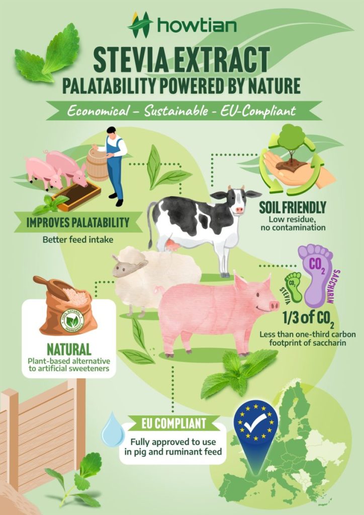 HOWTIAN’s Stevia Extract boasts a carbon footprint three times lower than sodium saccharin, reducing the environmental burden of feed production.